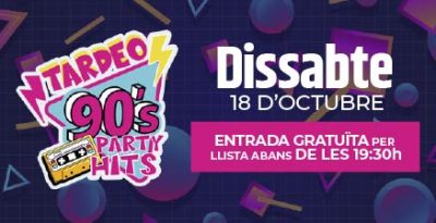 1) Entrada gratuïta per llista TARDEO 90s PARTY HITS (dissabte, 18/10/25 de 18:00h a 19:30h) 0,00 € 2) Entrada anticipada + consumició TARDEO 90s PARTY HITS – dissabte, 18/10/25 10,00 € 3) Entrada anticipada + consumició TARDEO/NIT HALLOWEEN – dissabte, 01/11/25 10,00 €